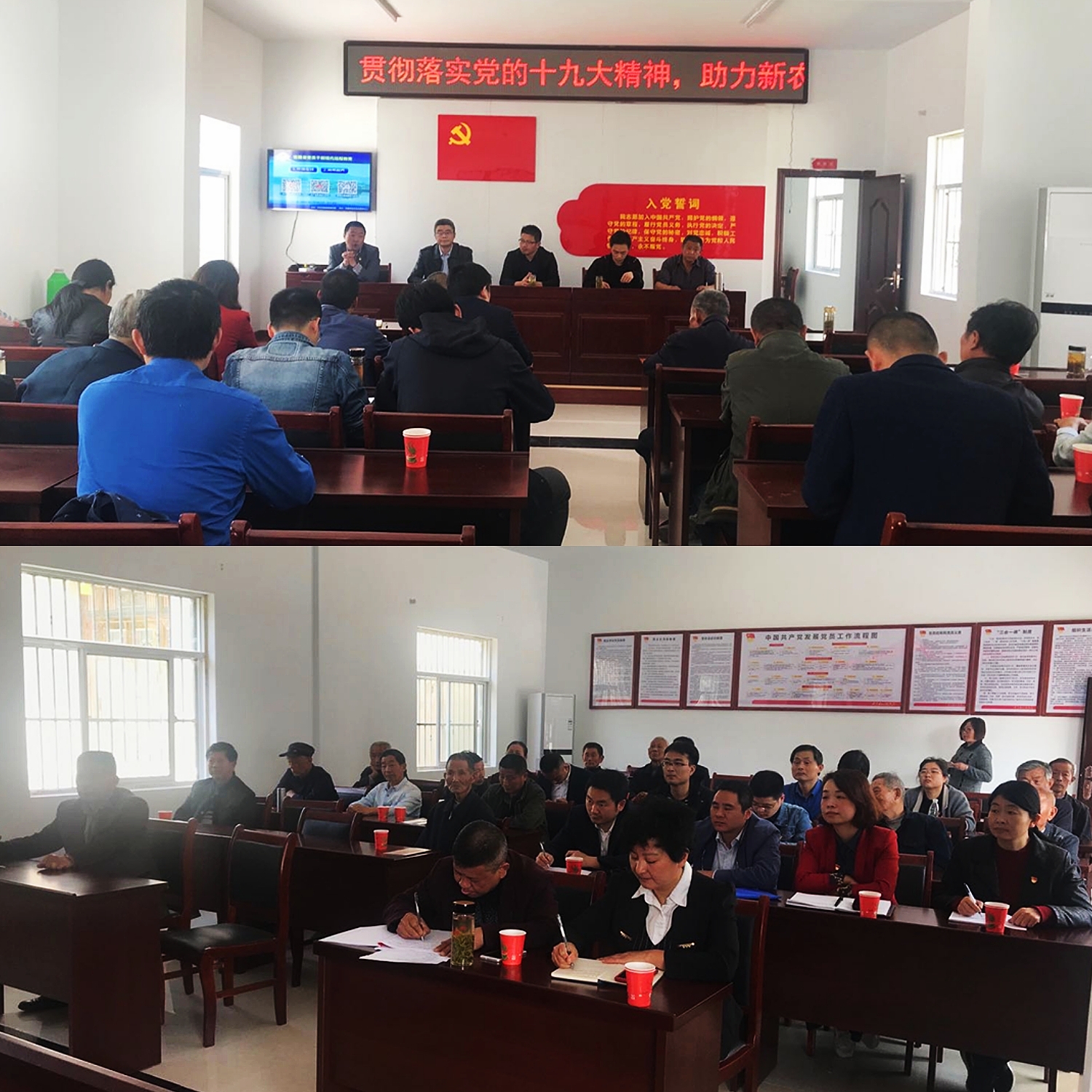 穿过村庄中心区,老师们来到杨梅村党群服务中心,在村委会会议室,早已有二十多名在村的党员村民等候在此,他们大多是上了年纪的老党员,特意来参加此次支部联合组织生活。朱培民首先向大家介绍了杨梅村村情和扶贫脱贫情况,纪天新介绍了学校、学院情况和此次主题党日活动的目的和意义。随后,支部特别邀请学校马克思主义学院徐东辉副教授给大家上了一堂精彩的党课。徐老师从习近平新时代中国特色社会主义思想提出的时代背景、物质基础、理论基础、主要内容以及下一步党的新征程等方面,深入浅出地解读了党的十九大报告,村民老党员们和老师们神情专注,会场不时响起热烈的掌声。